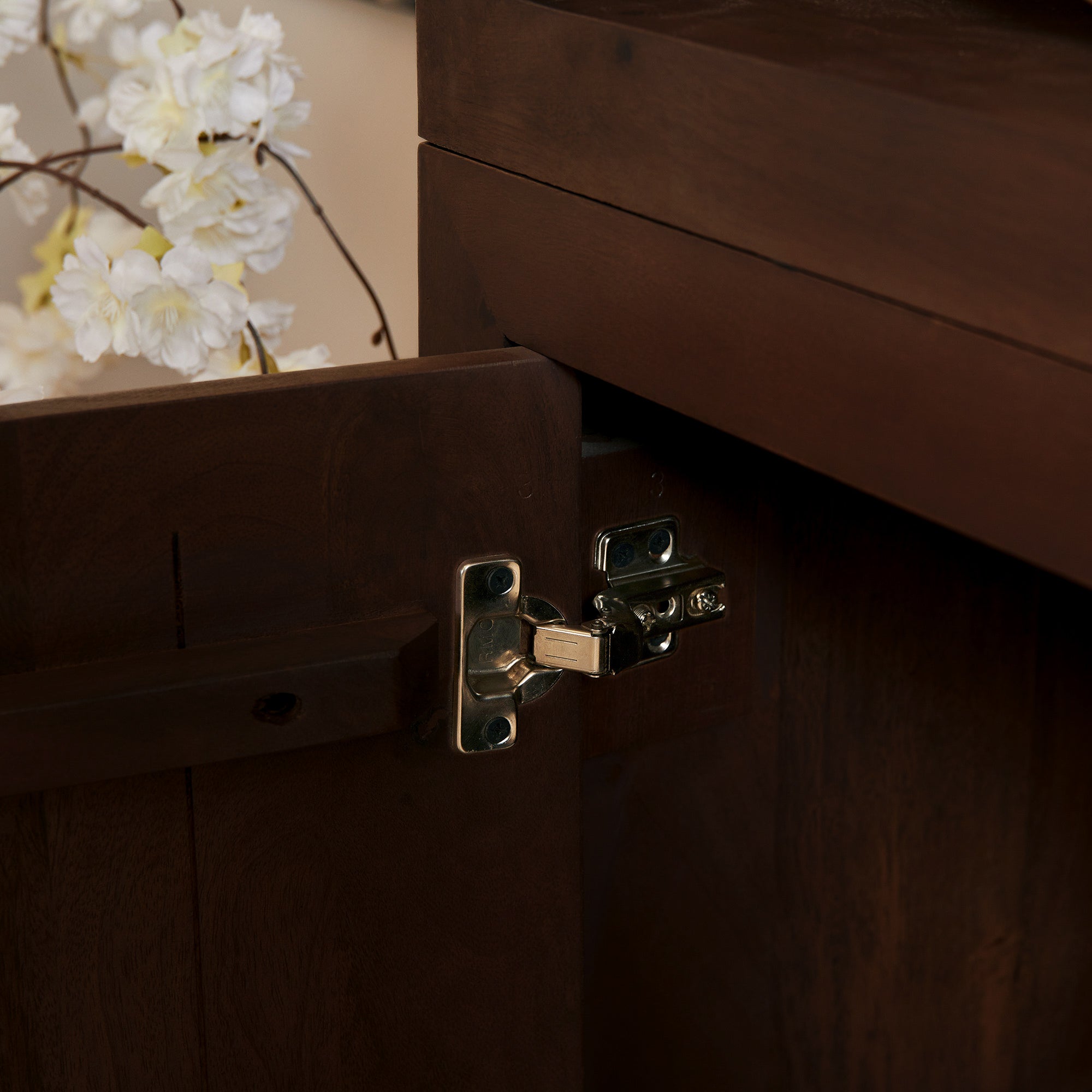 Ontdek de ruime en stijlvolle Vakkenkast Brussel Brown XL, gemaakt mangohout en afgewerkt met een verfijnde bruine finish. Dankzij het strakke en eigentijdse ontwerp biedt deze kast een perfecte combinatie van functionaliteit en stijl. Voorzien van meerdere open vakken en drie greeploze deuren met een handig push-to-open systeem, biedt deze kast voldoende opbergruimte.
